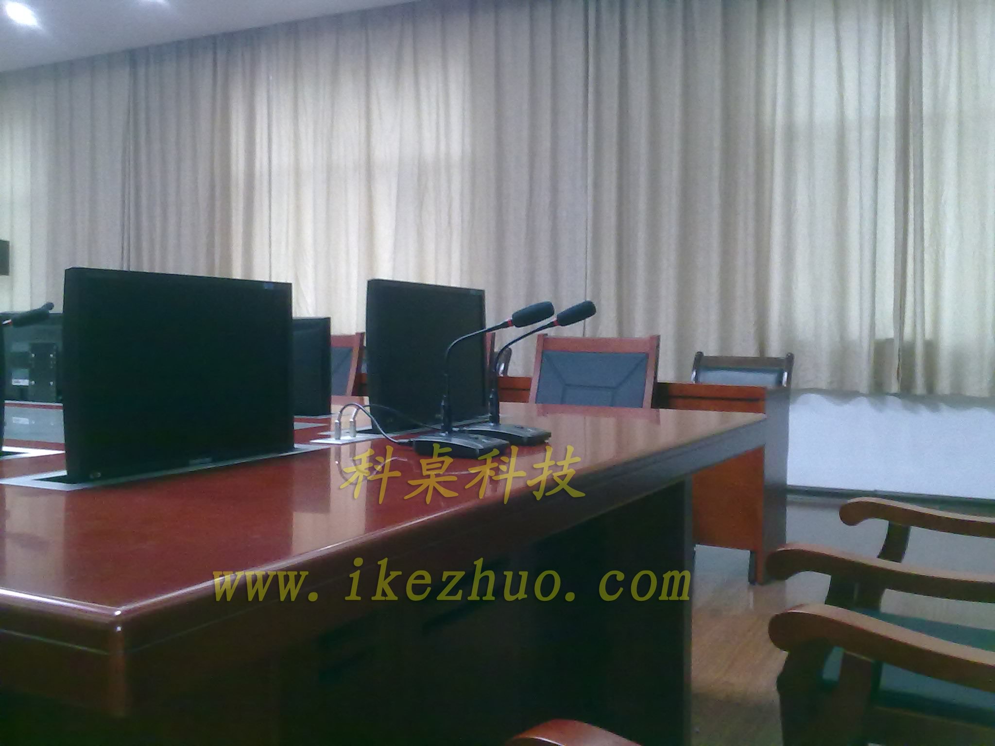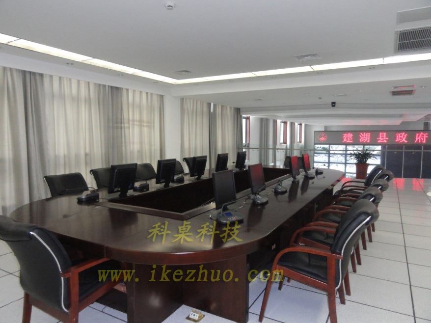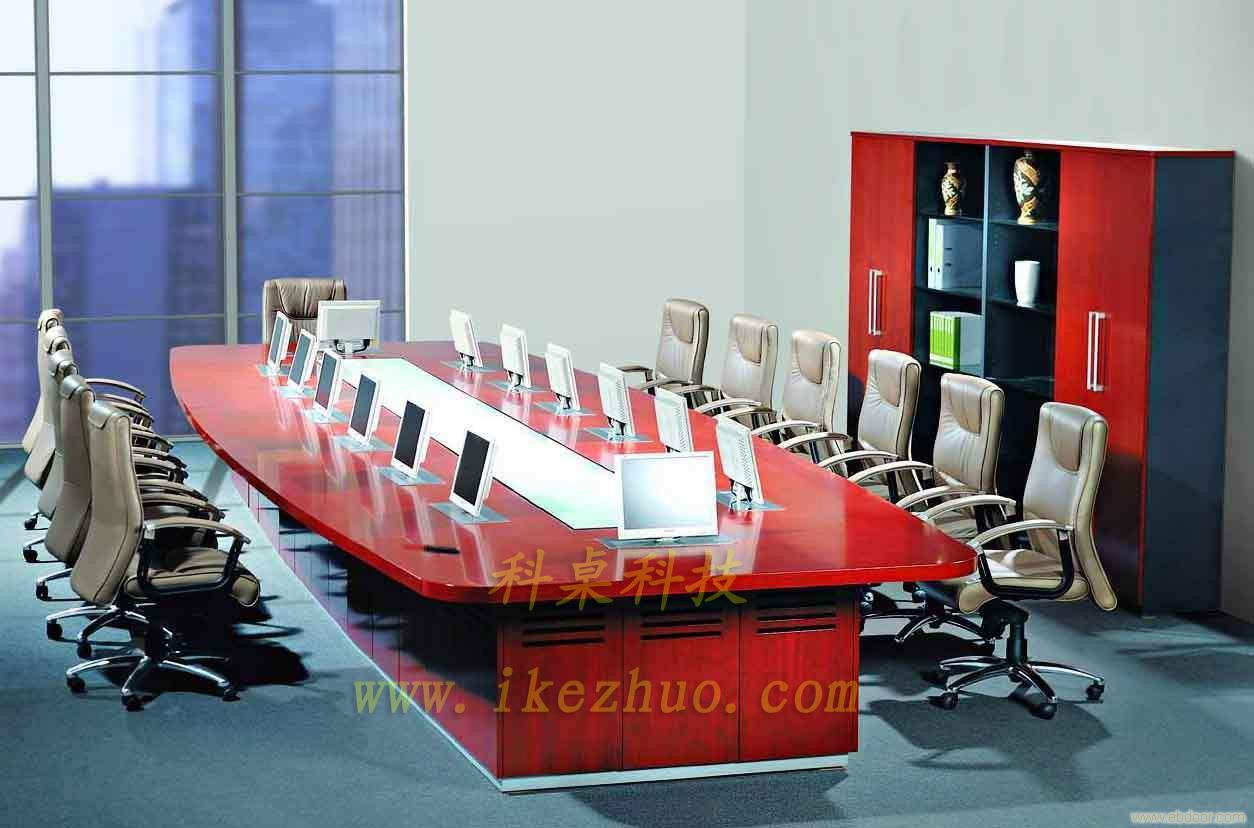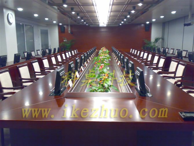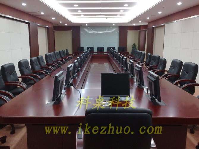 从会议桌下面升到桌面、◆当不使用显示器时,◆升降机自动下降,◆显示器隐藏在会议桌内,◆起到防尘,◆防盗,◆保持桌面平整美观。