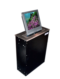 液晶屏升降器主要应用于大型会议室,高级多媒体网络系统,当需要举行会议时隐藏在会议桌内的升降机把显示屏从会议桌下面自动升到桌面并仰成一成角度,符合人机工程学原理,产品也可以左右调节角度,更有利于办公演示的需要,当不使用时显示屏可自动下降隐藏于会议桌内部,并自动关门,产品具有防盗、防尘保持桌面平整,美化桌面等功能。最新研制生产的同步带传输液晶显示屏升降器,克服了链条、和齿条升降器的噪音大、油污多、传动不稳定等缺点,是目前国内最新液晶屏升降器的传动方式。